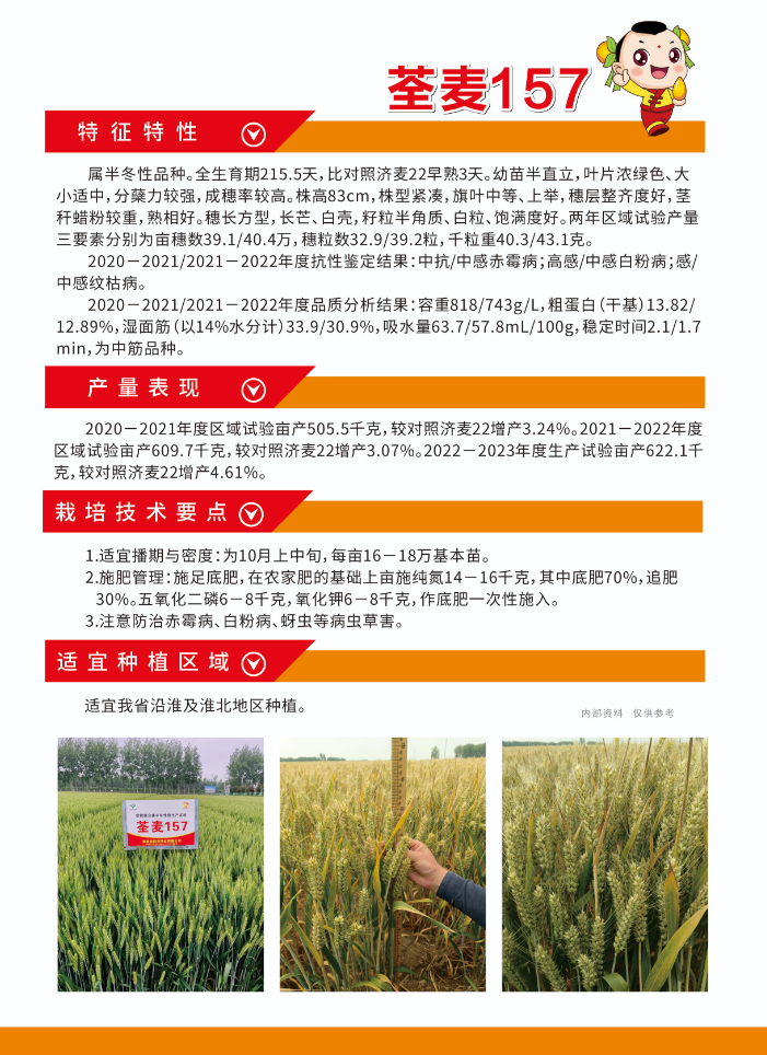 屬半冬性品種。全生育期215.5天,比對照濟麥22早熟3天。幼苗半直立,葉片濃綠色、大小適中,分蘗力較強,成穗率較高。株高83cm,株型緊湊,旗葉中等、上舉,穗層整齊度好,莖稈蠟粉較重,熟相好。穗長方型,長芒、白殼,籽粒半角質、白粒、飽滿度好。兩年區域試驗產量三要素分別為畝穗數39.1/40.4萬,穗粒數32.9/39.2粒,千粒重40.3/43.1克。