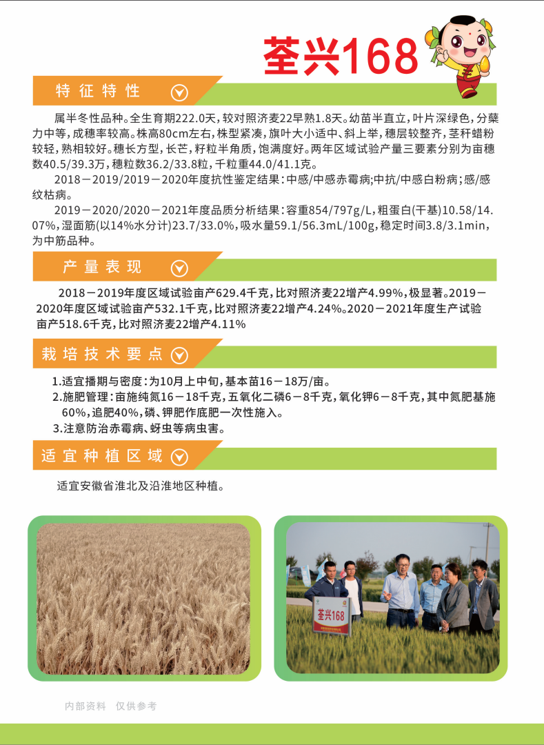 屬半冬性品種。全生育期222.0天,較對照濟麥22早熟1.8天。幼苗半直立,葉片深綠色,分蘗力中等,成穗率較高。株高80cm左右,株型緊湊,旗葉大小適中、斜上舉,穗層較整齊,莖稈蠟粉較輕,熟相較好。穗長方型,長芒,籽粒半角質,飽滿度好。兩年區域試驗產量三要素分別為畝穗數40.5/39.3萬,穗粒數36.2/33.8粒,千粒重44.0/41.1克。